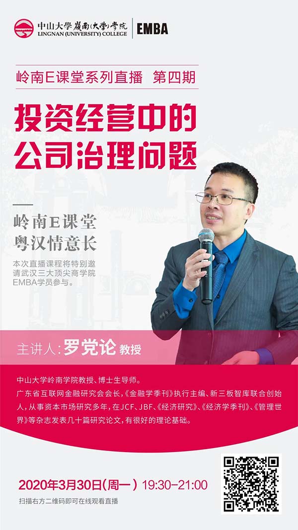 第四期“嶺南E課堂”直播講座將于3月30日重磅上線。屆時(shí)EMBA教育中心將邀我院羅黨論教授進(jìn)行《投資經(jīng)營(yíng)中的公司治理問(wèn)題——經(jīng)驗(yàn)與教訓(xùn)》主題講座,就目前疫情對(duì)國(guó)家經(jīng)濟(jì)影響下公司治理問(wèn)題進(jìn)行深度解剖與分析。