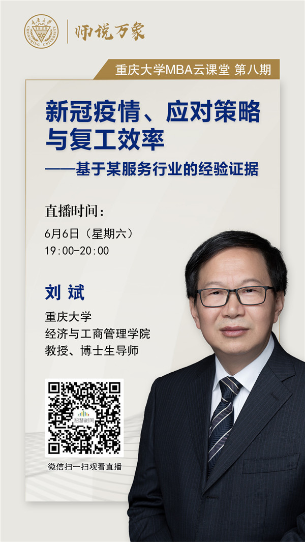 2020年6月6日(周六)19:00-20:00,重慶大學MBA中心網絡公開課系列——師說萬象推出第八期內容,重慶大學教授、博士生導師劉斌,將以“新冠疫情、應對策略與復工效率”為主題,以某服務行業(yè)的真實數據為例,對疫情響應、人口流動、政策總結、策略應對以及地理距離、服務延遲和模型檢驗等進行深入分析與探討。
