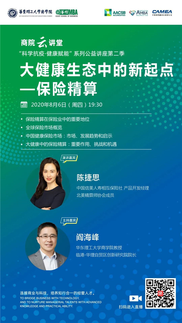 主題 華東理工大學(xué)商學(xué)院 科學(xué)抗疫·健康賦能系列公益講座第二季 第八期 大健康生態(tài)中的新起點(diǎn)——保險(xiǎn)精算 時(shí)間 2020年8月6日(周四)19:30 直播論壇詳情