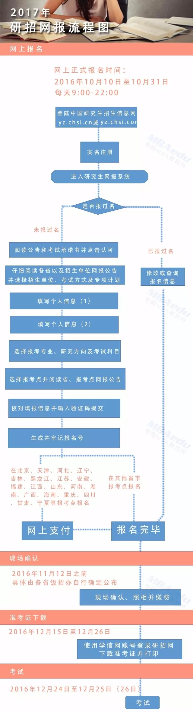 今天是2017年全國(guó)碩士研究生正式報(bào)名的第一天,小編溫馨提醒:抓緊時(shí)間預(yù)報(bào)名,不容忘記!正式報(bào)名(10.10-31)、現(xiàn)場(chǎng)確認(rèn)(由省招辦確定)、打1、選擇報(bào)考點(diǎn)的流程是怎樣的?