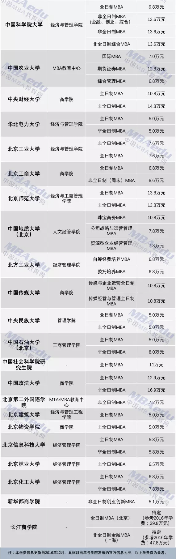 在2016年教育部發(fā)文將碩士研究生嚴(yán)格按照培養(yǎng)模式區(qū)分為全日制和非全日制之后,各商學(xué)院針對(duì)其MBA項(xiàng)目的2017年招生政策進(jìn)行了更改,以符合國家規(guī)定。小編本次對(duì)北京地區(qū)2017年入學(xué)MBA項(xiàng)目學(xué)費(fèi)的更新,是依據(jù)院校已經(jīng)公布的招生簡章、手冊、說明等進(jìn)行搜集整理的,部分項(xiàng)目招生簡章依然對(duì)于MBA是全日制還是非全日制沒有進(jìn)行明確區(qū)分,小編則依照中國研究生招生信息網(wǎng)中的碩士目錄,對(duì)其進(jìn)行了區(qū)分,方便大家查找。
