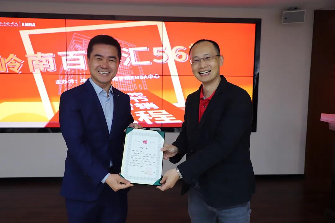 講座伊始,全體起立奏唱中山大學(xué)校歌。隨后,EMBA中心主任鄔金濤副教授代表學(xué)院向分享嘉賓贈送鳴謝函。同時,也感謝11夏鐘衛(wèi)紅校友提供的場地。
