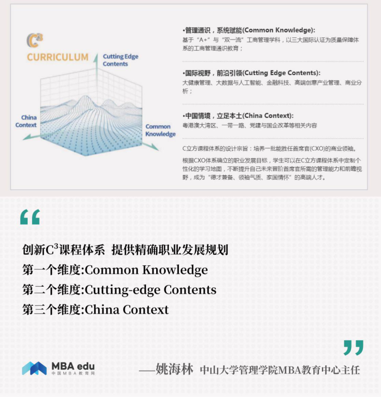 姚主任告訴筆者,中大管院MBA根據(jù)時代與技術(shù)發(fā)展及管理需求發(fā)展不斷革新培養(yǎng)方案。在培養(yǎng)方案3.0版本中,中大管院MBA提出了由“Common Knowledge”、“Cutting-edge Contents”、“China Context”三個維度組成的C3課程體系,旨在為學(xué)生提供具備扎實的理論基礎(chǔ)、前沿的學(xué)科內(nèi)容、豐富的本土內(nèi)涵相融合的商科教育。