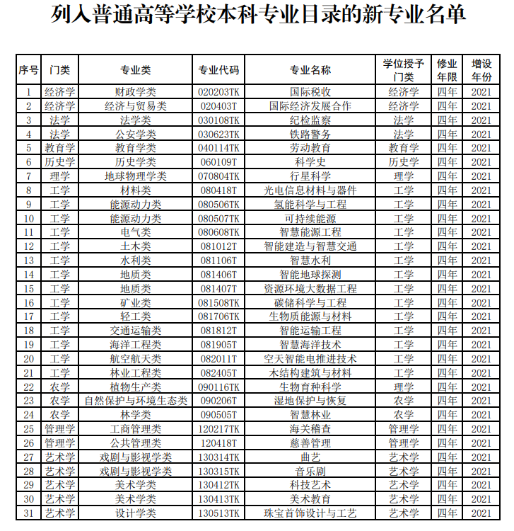 人民網(wǎng)北京2月24日電 (記者李依環(huán)、孫競)近日,教育部印發(fā)《關(guān)于公布2021年度普通高等學(xué)校本科專業(yè)備案和審批結(jié)果的通知》,新增1961個專業(yè)點、撤銷804個專業(yè)點。碳儲科學(xué)與工程、空天智能電推進技術(shù)、生物育種科學(xué)、資源環(huán)境大數(shù)據(jù)工程、濕地保護與恢復(fù)、智慧林業(yè)、勞動教育、科學(xué)史等31種新專業(yè)正式納入本科專業(yè)目錄。