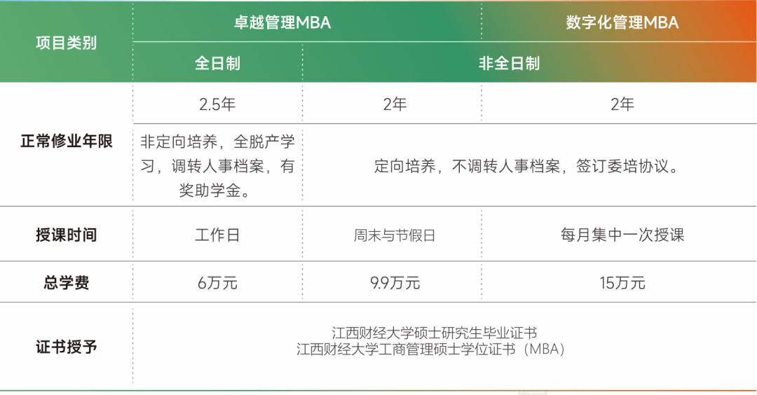 江西財(cái)經(jīng)大學(xué)MBA教育依托學(xué)校的學(xué)科、專業(yè)和智力優(yōu)勢(shì),服務(wù)區(qū)域經(jīng)濟(jì)社會(huì)發(fā)展,凸顯創(chuàng)新創(chuàng)業(yè)、東方管理和數(shù)字化特色,經(jīng)過多年的發(fā)展,已形成“江西是標(biāo)桿,中部有地位,全國(guó)有影響”的良好品牌效應(yīng),目前擁有卓越管理MBA、數(shù)字化管理MBA、 中美合作培養(yǎng)MBA以及非學(xué)歷培訓(xùn)等項(xiàng)目,為國(guó)家社會(huì)經(jīng)濟(jì)發(fā)展培養(yǎng)高級(jí)經(jīng)濟(jì)管理類人才近三萬(wàn)人,大多已成為 所在領(lǐng)域管理層的中堅(jiān)力量。