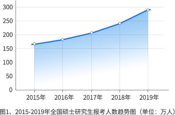 2018年12月23日,又一年的考研大戰(zhàn)開始,這一年的考研人數(shù),再一次變成了“歷史新高”。從教育部公布的數(shù)據(jù)來看,2019年全國(guó)考研報(bào)名人數(shù)達(dá)到了史無前例的290萬人,比2018年考研人數(shù)增加了52萬人,增幅達(dá)到了21.8%,考研增加人數(shù)和增長(zhǎng)率均為近年來最高。從上圖中我們可以看出,近5年,考研人數(shù)逐年增長(zhǎng),同2015年的165萬人相比增加了125萬人,研究生報(bào)考人數(shù)的快速上漲也引發(fā)了社會(huì)的廣泛關(guān)注。近幾年,由于考生個(gè)人對(duì)自身發(fā)展的要求提高、畢業(yè)生就業(yè)壓力較大、非全日制研究生考試納入統(tǒng)考以及研究生招生人數(shù)擴(kuò)大等多重因素的推動(dòng)下,全國(guó)碩士研究生報(bào)考人數(shù)呈現(xiàn)了逐年上升的態(tài)勢(shì)。