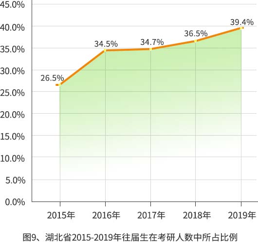 湖北省2015年往屆生所占比例為26.5%,到2019年所占比例升至39.4%: