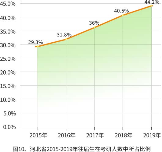 河北省2015年往屆生所占比例為29.3%,到2019年這個(gè)比例升至44.2%: